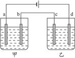 如圖所示:a、b、c、d均為鉑電極,供選擇的四組電解質(zhì)溶液列表中,電解時(shí)要求滿足的條件是:①通電一段時(shí)間后,甲、乙兩池的pH均下降,②電極a、c上得到電子形成的原子個(gè)數(shù)比為1∶2,則電解液的編號(hào)正確的是 ( )![]()