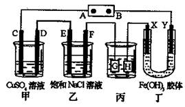 如下圖所示的裝置,C、D、E、F、X、Y都是惰性電極。將電源接通后,向乙中滴入酚酞試液,在F極附近顯紅色。則以下說法不正確的是( )![]()