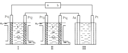 如圖所示,裝置Ⅰ和Ⅱ為氫氧燃料電池,裝置Ⅲ為400ml0.1mol/L硝酸銀溶液,ab是用飽和NaCl溶液浸泡過的濾紙。下列說法正確的是![]()