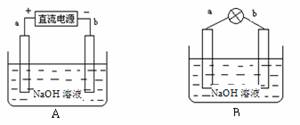 (1)如圖A所示:a、b均為多孔石墨棒(多孔石墨棒,可吸附并儲存生成的氣體),其中a與直流電源正極相連,b與直流電源負極相連,電解質(zhì)溶液為NaOH溶液,則a電極上發(fā)生的電極反應(yīng)式為_________________,電解后溶液的pH____________(填“增大”、“減小”或“不變”)!