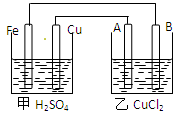 (1)甲裝置是 池,乙裝置是 池且Fe極為 極,A極為 極