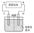 下圖是用鉛蓄電池為電源,模擬氯堿工業(yè)電解飽和食鹽水的裝置圖(C、D均為石墨電極)。![]()