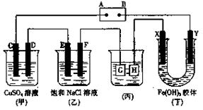 (10分)如下圖所示的裝置,C、D、E、F、X、Y都是惰性電極。將電源接通后,向乙中滴入酚酞液,在F極附近顯紅色。試回答以下問題:![]()