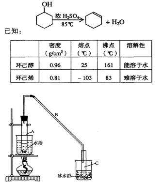 將12.5 mL環(huán)己醇加入試管A中,再加入l mL濃硫酸,搖勻后放入碎瓷片,緩慢加熱至反應(yīng)完全,在試管C內(nèi)得到環(huán)己烯粗品。