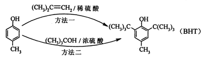 BHT(Butylated Hydroxy Toluene)是一種常用的食品抗氧化劑,合成方法有如下兩種,下列說法正確的是( )![]()