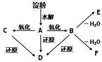 (10分).如下圖所示:淀粉水解可產(chǎn)生某有機化合物A,A在不同的氧化劑作用下,可以生成B(C6H12O7)或C(C6H10O8),B和C都不能發(fā)生銀鏡反應。A、B、C都可以被強還原劑還原成為D(C6H14O6)。B脫水可得到五元環(huán)的酯類化合物E或六元環(huán)的酯類化合物F。![]()