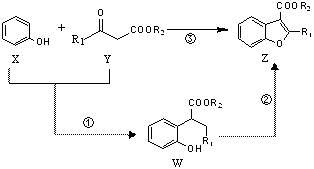 科學(xué)家用催化劑將苯酚(X)和1,3-二羰基化合物(Y)合成一種重要的具有生物活性的結(jié)構(gòu)單元——苯并呋喃(Z),W是中間產(chǎn)物(R1、R2均為烷烴基)。則下列有關(guān)敘述正確的是![]()