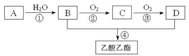 (8分)工業(yè)上以A為主要原料來合成乙酸乙酯,其合成路線如下圖所示。其中A是石油裂解氣的主要成份,A的產(chǎn)量通常用來衡量一個國家的石油化工水平。又知2CH3CHO+O2