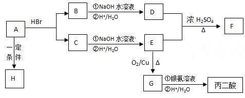 下列是A、B、C、D、E、F、G、H及丙二酸(HOOCCH2COOH)間轉(zhuǎn)化反應(yīng)的關(guān)系圖。A是一種鏈狀羧酸,分子式為C3H4O2;F中含有由七個原子構(gòu)成的環(huán);H是一種高分子化合物。請?zhí)顚懴铝锌瞻祝?img src="http://thumb.zyjl.cn/pic5/tikupic/be/b/gp0f82.gif" style="vertical-align:middle;" />![]()