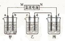 下圖所示裝置中,甲、乙、丙三個(gè)燒杯依次分別盛放100 g 5.00%的NaOH溶液、足量的CuSO4溶液和100 g 10.00%的K2SO4溶液,電極均為石墨電極。![]()