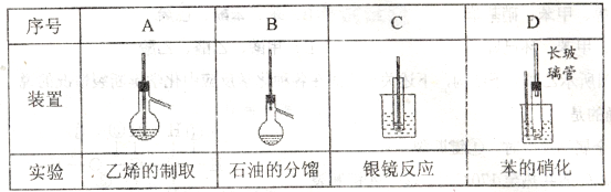 A~D是中學(xué)化學(xué)實(shí)驗(yàn)中使用溫度計(jì)的裝置示意圖,其中所做實(shí)驗(yàn)與裝置不相符的是![]()