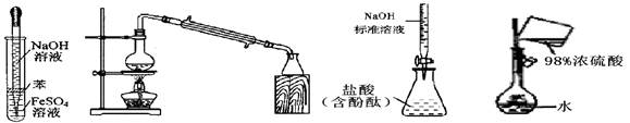 | A.制備氫氧化亞鐵 | B.石油的分餾 | C.測(cè)定鹽酸濃度 | D.配制稀硫酸 |