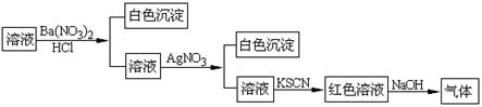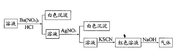 某同學(xué)為檢驗溶液中是否含有常見的四種無機離子,進行了下圖所示的實驗操作。其中檢驗過程中產(chǎn)生的氣體能使?jié)駶櫦t色石蕊試紙變藍。由該實驗?zāi)艿玫降恼_結(jié)論是![]()
