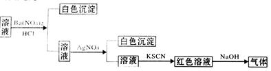 某同學(xué)為檢驗(yàn)?zāi)橙芤褐惺欠窈谐R姷乃姆N離子,進(jìn)行了下圖所示的實(shí)驗(yàn)操作,其中檢驗(yàn)過程中產(chǎn)生的氣體能使?jié)駶櫟募t色石蕊試紙變藍(lán)。由該實(shí)驗(yàn)?zāi)艿玫降恼_結(jié)論是![]()