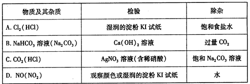 下列物質(zhì)中的雜質(zhì)(括號(hào)內(nèi)為雜質(zhì))的檢驗(yàn)、除雜的試劑或方法正確的是( )![]()