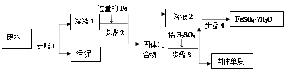 (12分)已知某工業(yè)廢水中含有大量FeSO4,較多的Cu2+,少量的Na+ 以及部分污泥,通過(guò)下列流程可從該廢水中回收FeSO4·7H2O晶體及金屬Cu。![]()