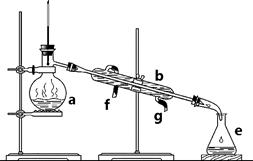 ⑶ 若利用裝置I分離四氯化碳和酒精的混合物,還缺少的儀器是______________,將儀器補充完整后進行實驗,溫度計水銀球的位置在_____________________處。冷凝水由________(填f或g)口通入,_________口流出。