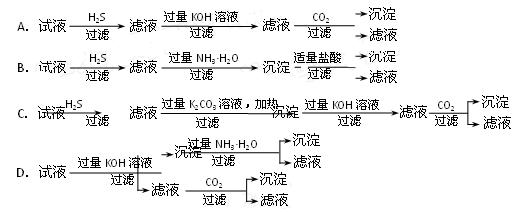 某溶液中含有K+、Mg2+、Al3+、Cu2+等離子,為了將它們一一分離(不要求各離子恢復到原來的形態(tài)),某同學設(shè)計了如下四個實驗方案,其中不正確的是[已知:Mg2+、Al3+溶液中通入H2S不產(chǎn)生沉淀;Ksp(CuS )=1.3×10-36。![]()