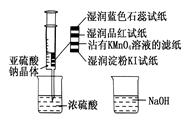 如圖,在注射器中加入少量Na2SO3晶體,并吸入少量濃硫酸(以不接觸紙條為準(zhǔn))。則下列有關(guān)說(shuō)法正確的是![]()