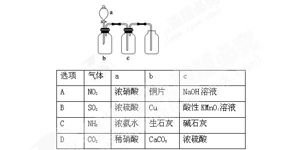 下圖裝置可用于制取、提純并收集表格中的四種氣體(a、b、c表示相應(yīng)儀器中加入的試劑),其中可行的是( )![]()