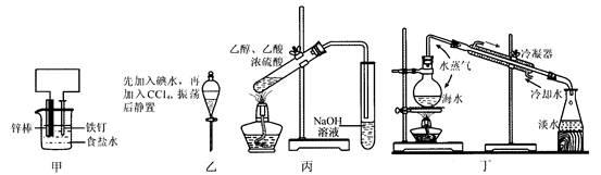 | C.裝置丙:實(shí)驗(yàn)室制取乙酸乙酯 | D.裝置。汉K麴s得淡水 |