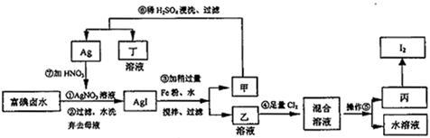 (10分)在已經(jīng)提取氯化鈉、溴、鎂等化學(xué)物質(zhì)的富碘鹵水中,采用下面的工藝流程生產(chǎn)單質(zhì)碘:![]()