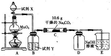 某化學活動小組設計如圖所示裝置(部分夾持裝置已略去)實驗,以探究潮濕的Cl2與Na2CO3反應的產(chǎn)物。![]()