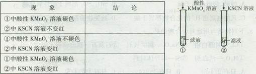(3分)某同學(xué)為了檢驗(yàn)家中的一瓶補(bǔ)鐵藥(成分為FeS04)是否變質(zhì),設(shè)計(jì)了如下實(shí)驗(yàn):將藥片除去糖衣研細(xì)后,溶解過(guò)濾,取濾液分別加入兩支試管中,再進(jìn)行如下圖所示操作。 請(qǐng)?zhí)畛鲈撏瑢W(xué)實(shí)驗(yàn)中出現(xiàn)以下現(xiàn)象時(shí)所應(yīng)得到的結(jié)論:![]()