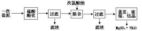 MgSO4·7H2O醫(yī)藥上用作瀉劑。工業(yè)上用氯堿工業(yè)中的一次鹽泥為原料生產(chǎn)。已知一次鹽泥中含有鎂、鈣、鐵、鋁、錳的硅酸鹽和碳酸鹽等成分。主要工藝如下:![]()