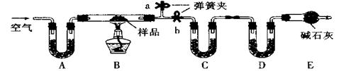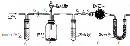 ②稱取天然堿樣品7.3g,并將其放入硬質(zhì)玻璃管中;稱量裝濃硫酸的洗氣瓶的質(zhì)量為 87.6g,裝堿石灰的U型管D的質(zhì)量為74.7g。