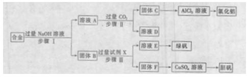 為探索工業(yè)廢料的再利用,某化學(xué)興趣小組設(shè)計了如圖-5實驗方案,用含有鋁、鐵和銅的合金制取氯化鋁、綠礬晶體(FeSO4·7H2O)和膽礬晶體。![]()