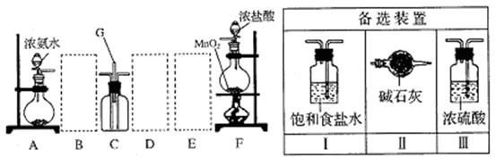某課外活動(dòng)小組用如圖所示的實(shí)驗(yàn)裝置探究氯氣與氨氣之間的反應(yīng)。其中A、F為氨氣和氯氣的發(fā)生裝置,C為純凈、干燥的氯氣與氨氣反應(yīng)的裝置。![]()