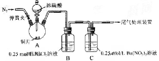 與可溶性鋇的強(qiáng)酸鹽能否反應(yīng)生成白色BaSO3沉淀,用下圖所示裝置進(jìn)行實(shí)驗(yàn)(夾持裝置和A中加熱裝置已略,氣密性已檢驗(yàn))![]()