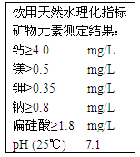 下圖為農(nóng)夫山泉礦泉水瓶上的部分說(shuō)明文字,列出了該飲用天然水理化指標(biāo)。這里的鈣、鎂、鉀、鈉是指![]()