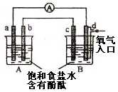 化學(xué)實(shí)驗(yàn)小組在學(xué)習(xí)化學(xué)電源和氯堿工業(yè)相關(guān)知識后,在實(shí)驗(yàn)室進(jìn)行實(shí)驗(yàn)驗(yàn)證,他們設(shè)計組裝了如下圖所示裝置,已知a為石墨電極;b為鐵電極;c為鋁電極(已除去表面氧化膜);d為多孔石墨電極,燒杯中是足量飽和食鹽水(滴有酚酞),連好導(dǎo)線后,電流計指針發(fā)生明顯偏轉(zhuǎn)。下列判斷正確的是![]()