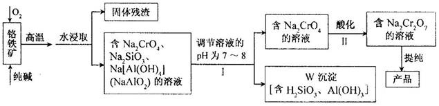 (12分)重鉻酸鈉(Na2Cr2O7)廣泛用于合成顏料、媒染劑等,以鉻鐵礦(主要成分為Cr2O3,還有FeO、Al2O3、SiO2等雜質(zhì))為原料制取重鉻酸鈉的流程圖如下:![]()