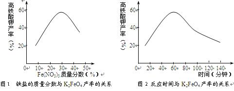 (3)根據(jù)圖1、圖2回答:為了獲取更多的高鐵酸鉀,鐵鹽的質(zhì)量分?jǐn)?shù)應(yīng)控制在 附近、反應(yīng)時(shí)間應(yīng)控制在 。![]()