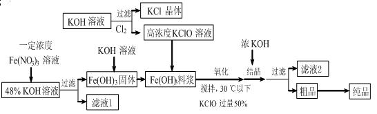 (11分)高鐵酸鉀(K2FeO4)是一種新型、高效、多功能水處理劑,且不會(huì)造成二次污染。已知高鐵酸鹽熱穩(wěn)定性差,工業(yè)上用濕法制備高鐵酸鉀的基本流程如下圖所示:![]()