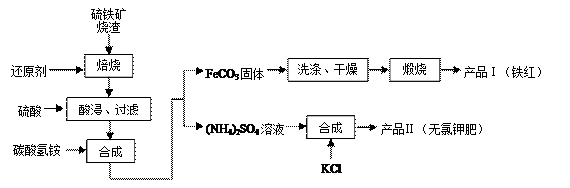 (12分)硫鐵礦燒渣(主要成分為Fe2O3、Fe3O4、FeO、SiO2等)是生產(chǎn)硫酸的工業(yè)廢渣,其綜合利用對環(huán)境保護(hù)具有現(xiàn)實(shí)意義。利用硫鐵礦燒渣制備鐵紅等產(chǎn)品的實(shí)驗(yàn)流程如下: ![]()