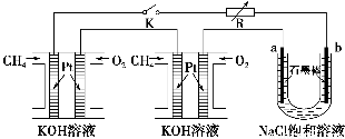 新型高效的甲烷燃料電池采用鉑為電極材料,兩電極上分別通入CH4和O2,電解質(zhì)為KOH溶液。某研究小組將兩個(gè)甲烷燃料電池串聯(lián)后作為電源,進(jìn)行飽和氯化鈉溶液(滴有幾滴酚酞)電解實(shí)驗(yàn),如圖所示。