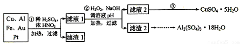 為了降低電子垃圾對(duì)環(huán)境構(gòu)成的影響,將一批廢棄的線路板簡(jiǎn)單處理后,得到含70%Cu、25%Al、4%Fe及少量Au、Pt等金屬的混合物,并設(shè)計(jì)出如下制備硫酸銅和硫酸鋁晶體的路線: