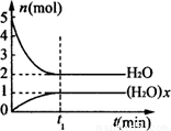 D.t1時刻,保持溫度不變,再充入1mol H2O(g),重新達到平衡時,c[(H2O)x]/c[H2O]增大