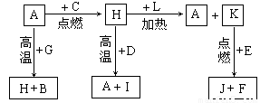 A、B、C、D、E、F是常見單質(zhì),其中A是用量最大,應(yīng)用最廣泛的金屬;元素D是地殼中含量最多的金屬元素;D元素和E元素在周期表中相鄰。G、H、I、J、K、L是常見化合物,其中G在常溫下是無色液體,K、L是無色氣體,且K是非極性分子,F(xiàn)、H是黑色晶體。以上物質(zhì)相互間的轉(zhuǎn)化關(guān)系如下圖所示: