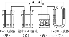 如下圖所示的裝置,C、D、E、F、X、Y都是惰性電極。將電源接通后,向(乙)中滴入酚酞溶液,在F極附近顯紅色。則以下說法正確的是