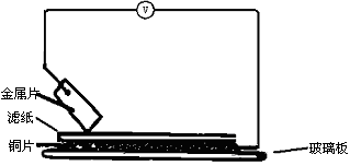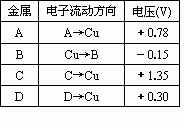 將潔凈的金屬片A、B、C、D分別放置在浸有鹽溶液的濾紙上面并壓緊(如圖所示),在每次實(shí)驗(yàn)時(shí),記錄電壓表指針的移動(dòng)方向和電壓表的讀數(shù)如下: