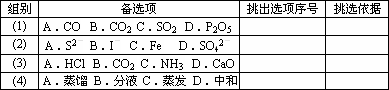 下表中每組各有四個選項,請從中挑選出一個選項,它跟另三個選項屬于不同的“分類”,請將挑選出的選項的序號及挑選依據(jù)填入下表.