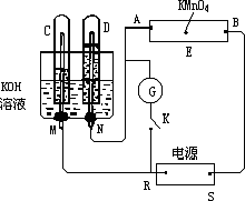 如圖,E為沾有Na2SO4溶液的濾紙,并加入幾滴酚酞.A,B分別為Pt片,壓在濾紙兩端,R、S為電池的電極.M、N是用多微孔的Ni制成的電極材料,它在堿溶液中可以視為惰性電極.G為電流計,K為開關(guān).C、D和電解池中都充滿濃KOH溶液.若在濾紙中央點上一滴紫色的KMnO4溶液,K打開,接通電源一段時間后,C、D中有氣體產(chǎn)生.