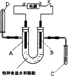 某實(shí)驗(yàn)興趣小組利用下圖所示裝置進(jìn)行電解食鹽水并檢驗(yàn)其生成產(chǎn)物的實(shí)驗(yàn),當(dāng)圖中開(kāi)關(guān)k閉合片刻后,試填空: