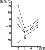 下圖中每條折線表示周期表ⅣA-ⅦA中的某一族元素氫化物的沸點變化,每個小黑點代表一種氫化物,其中a點代表的是