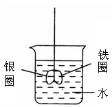 如圖所示的裝置,在鐵圈和銀圈的焊接處,用一根棉線將其懸吊在盛水的燒杯中,使之平衡.小心地向燒杯中央滴入